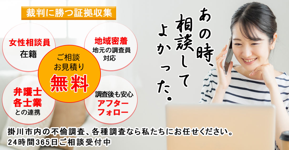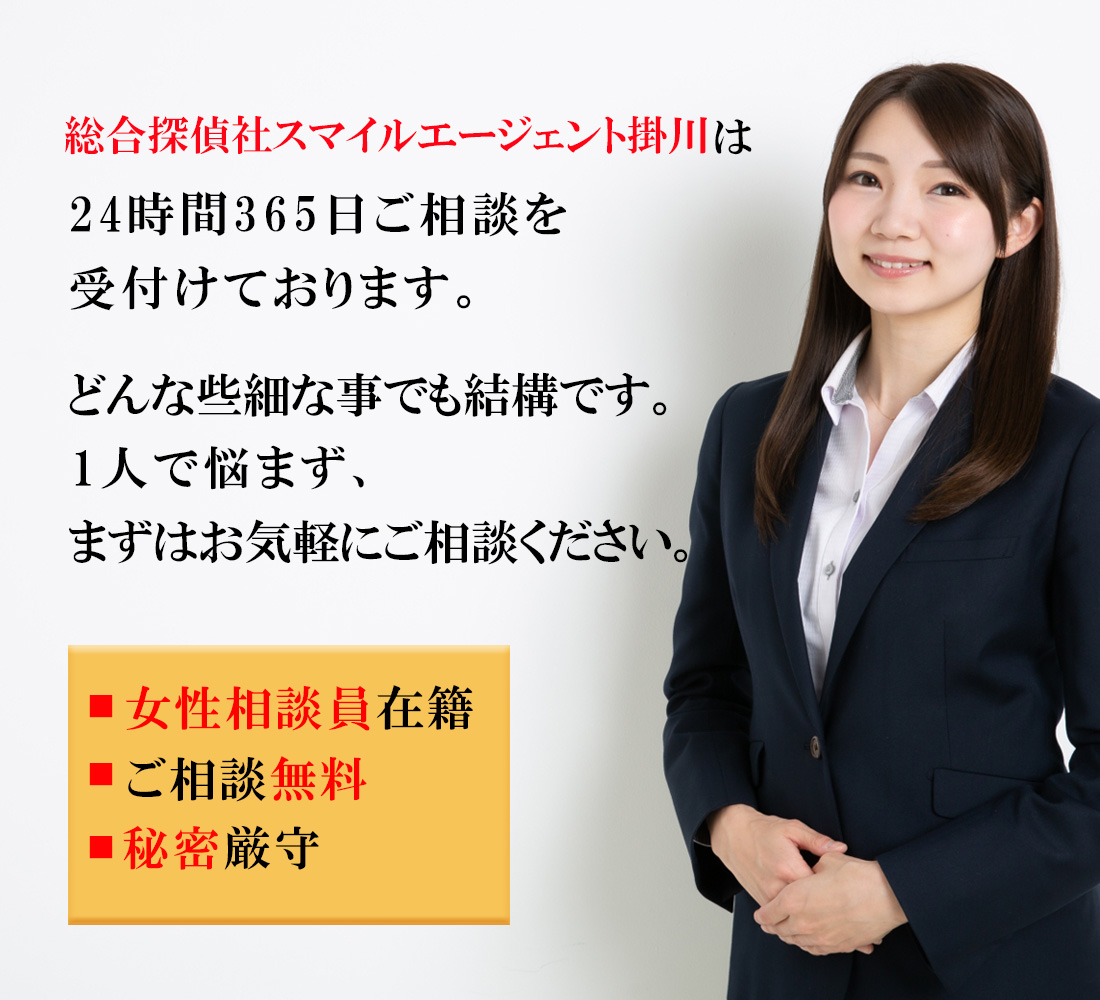 掛川市で不倫・浮気調査や行方調査、ペット捜索などの各種調査で探偵をお探しの際にはご相談・お見積りは無料となっておりますので一度、総合探偵社スマイルエージェント掛川までお気軽にご相談ください。